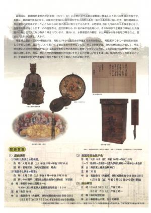 埼玉県立歴史と民俗の博物館では、昭和53年から昌国寺が所蔵する資料を受託し、常設展示でその一部を展示活用していましたが、昌国寺について紹介する機会はありませんでした。本展では、埼玉県立歴史と民俗の博物館と共催して、埼玉県立歴史と民俗の博物館が受託する昌国寺資料と同寺に残る什物を合わせて展示公開しました。