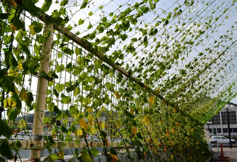 長くツルを伸ばし、庁舎に限らず、そこを通る人にも日除けの役割を果たしています。今後の成長が楽しみです。