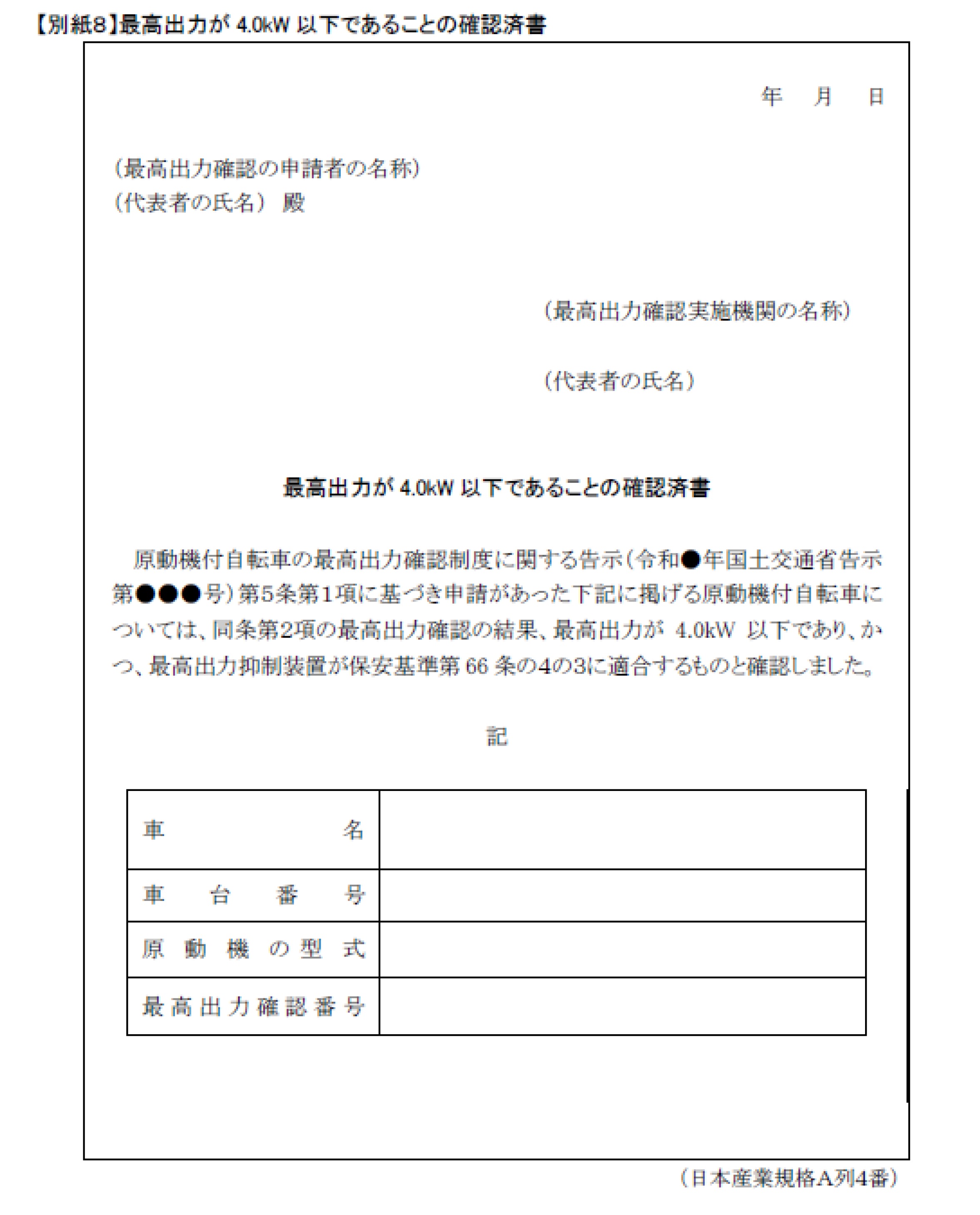 国土交通省が運用する最高出力確認制度に基づいて、確認実施機関(国土交通大臣が認定した最高出力確認を実施する者)が個々の車両ごとに発行する最高出力確認済み証明書又は確認実施機関による最高出力確認済みの表示(シール)が確認できる印刷物 ※スマホ等の画像提示のみでは登録できません。